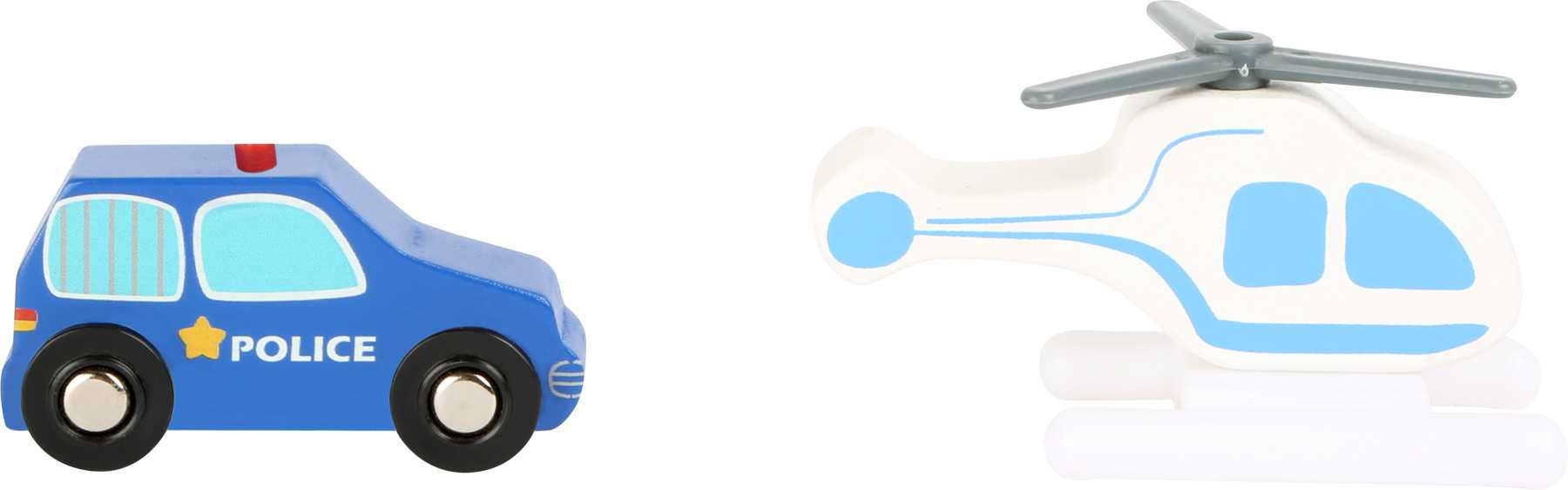 12 pièces. Ici, il se passe toujours quelque chose! Avec ce commissariat de notre univers de jeu small foot world, l’action est garantie! L’association de bois naturel et d’éléments stables en plastique propose de nombreux accessoires pour les jeunes policières et policiers qui peuvent laisser libre cours à leur imagination. Le terrain d'atterrissage pour hélicoptère, la rampe des parkings et une véritable cellule de prison constituent les points forts! C’est parti pour la première intervention: descend la rampe avec la voiture de police, décolle avec l’hélicoptère et chasse les voleurs! Une poursuite endiablée à travers la chambre d’enfant débute, mais à la fin, le voleur termine toujours dans sa cellule de prison! Le commissariat peut être parfaitement associé à d’autres produits small foot world et garantit un plaisir de jeu passionnant et varié!