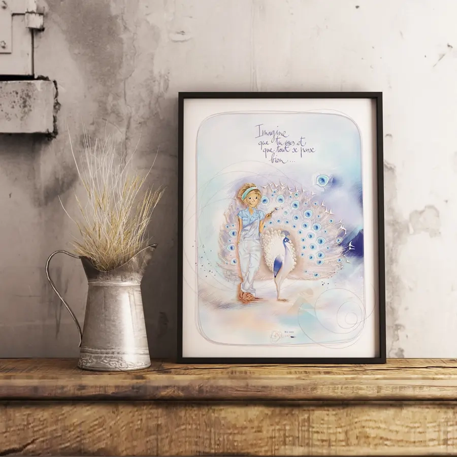 Affichez l'optimisme avec le poster Mon Amie Luce en édition limitée 30 x 40 cm, illustré par Myra Vienne, portant la citation : "Imagine que tu oses et que tout se passe bien". Imprimé en Belgique sur papier FSC, chaque exemplaire est unique et livré sans cadre, prêt à embellir votre espace.