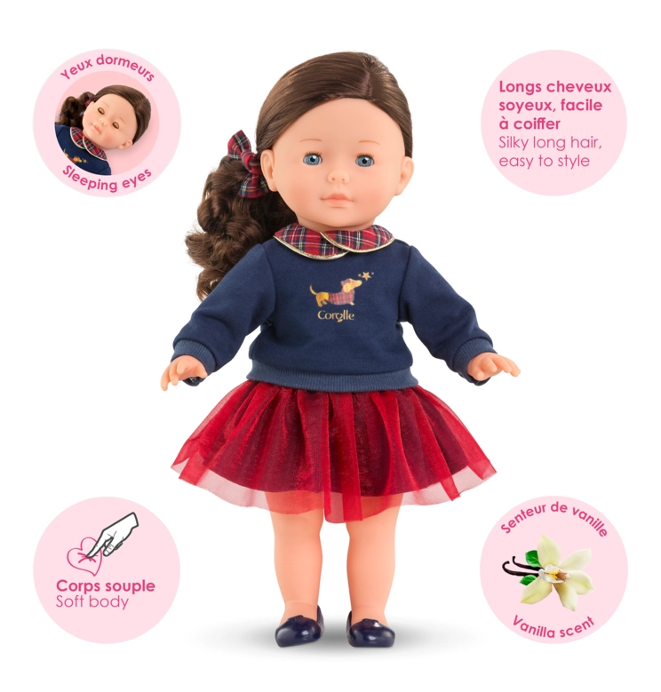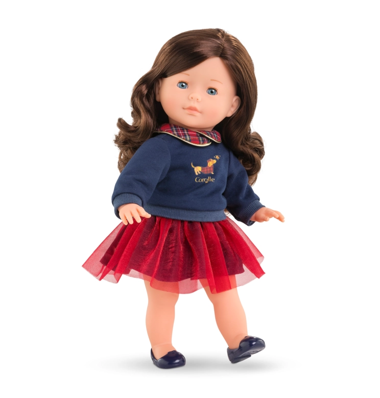 Perle Corolle en Fêtes est une poupée de 36 cm en édition limitée, parfaite pour célébrer les fêtes de fin d'année. Elle est habillée d'un élégant sweat bleu marine avec un col claudine en tissu écossais, orné d'une sérigraphie pailletée représentant un petit teckel en manteau écossais. Sa tenue est complétée par une magnifique jupe en tulle rouge, une paire de ballerines bleu marine et un chouchou assorti.
