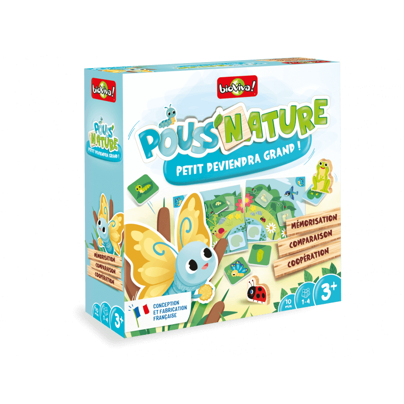 Pouss’Nature - Petit deviendra grand ! est un jeu coopératif pour enfants dès 3 ans, permettant de découvrir les cycles de vie du papillon et du tournesol en s'amusant.