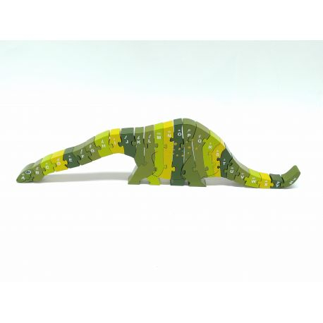 Puzzle en bois en forme de diplodocus pour apprendre l'alphabet, fabriqué en bois d'hévéa recyclé, avec lettres cursives et capitales.