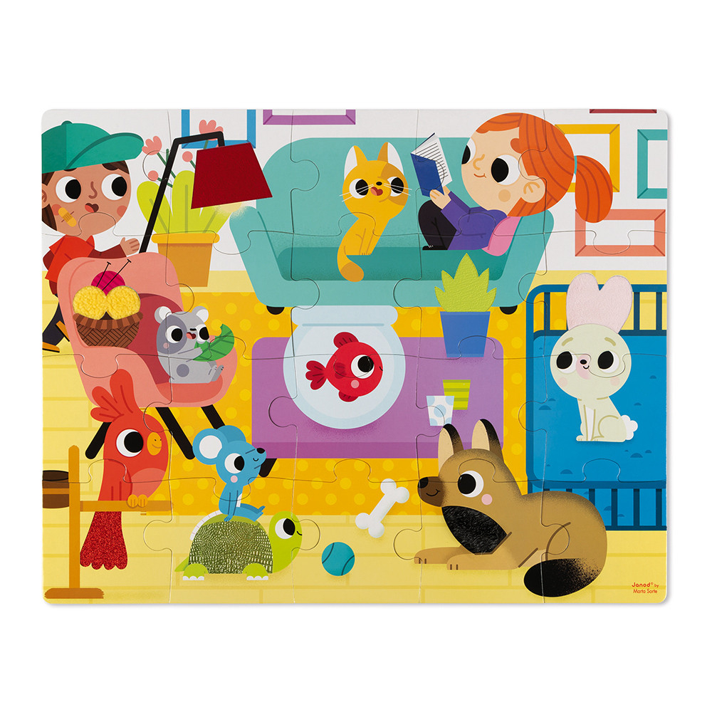 Le Puzzle Tactile Animaux Domestiques de Janod est un puzzle géant de 20 pièces conçu pour éveiller les sens des enfants dès 2 ans. Avec 7 pièces texturées représentant différents animaux et objets, il stimule le toucher et la motricité fine. Un poster inclus sert de modèle pour faciliter l'assemblage.