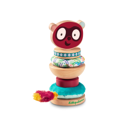 La Pyramide à empiler Georges de Lilliputiens est un jouet d'éveil en bois et tissu pour enfants dès 12 mois, favorisant la motricité fine et la stimulation sensorielle.