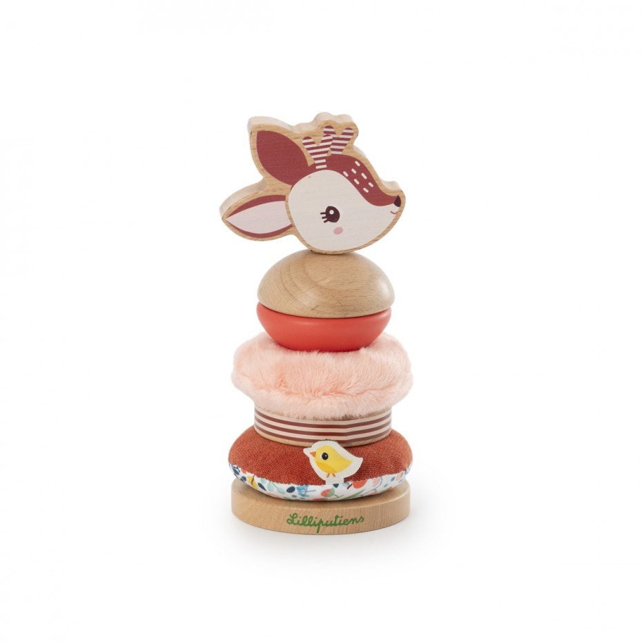 La pyramide à empiler Stella le faon de Lilliputiens est un jouet d'éveil en bois et tissu, conçu pour stimuler la motricité fine et les sens des enfants dès 12 mois.