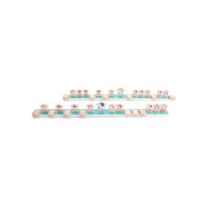 Qui est Moo est un jeu de devinettes en bois pour enfants dès 6 ans, où l'on pose des questions pour deviner la vache choisie par l'adversaire.