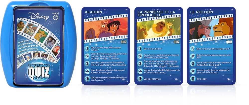 Testez vos connaissances sur l'univers Disney avec le Quizz Disney de Winning Moves. 500 questions illustrées, format compact, idéal pour des parties en famille ou entre amis. Dès 8 ans.