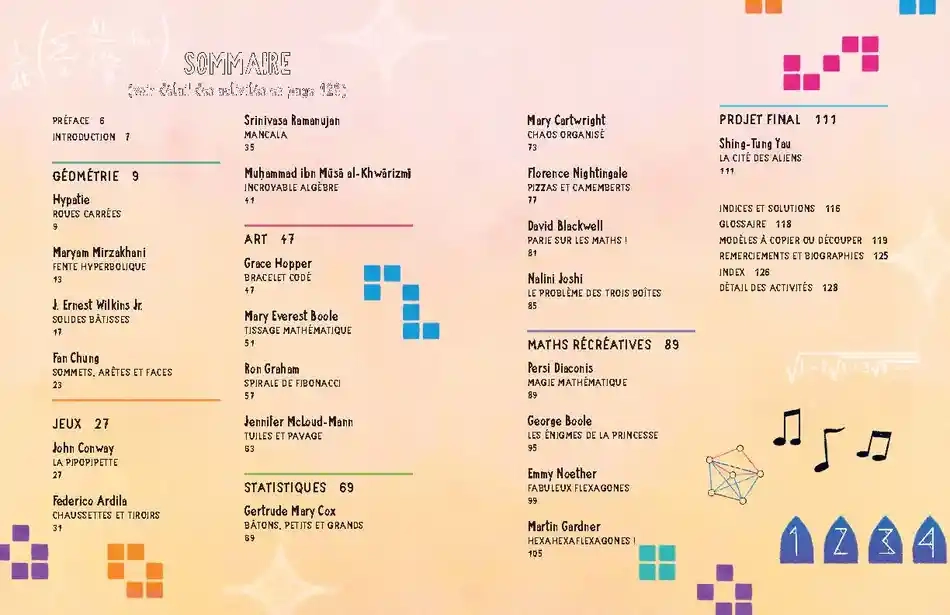 Réalise des jeux scientifiques inspirés des grands mathématiciens est un livre interactif pour enfants dès 7 ans, proposant 22 activités ludiques basées sur les travaux de mathématiciens célèbres. Chaque activité aborde des domaines tels que la géométrie, les statistiques, l'algèbre et la logique, permettant aux jeunes lecteurs de s'initier aux mathématiques tout en s'amusant.