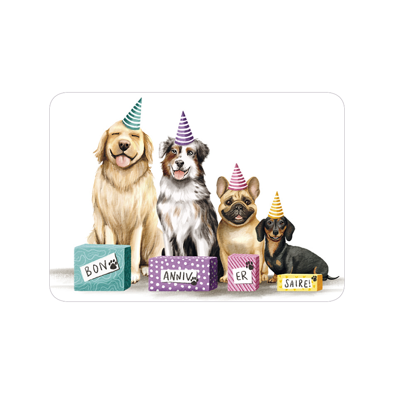 Carte d'anniversaire "Ouaf Ouaf" de R. Hilyer, idéale pour les amoureux des chiens. Design charmant et humoristique pour souhaiter un joyeux anniversaire.