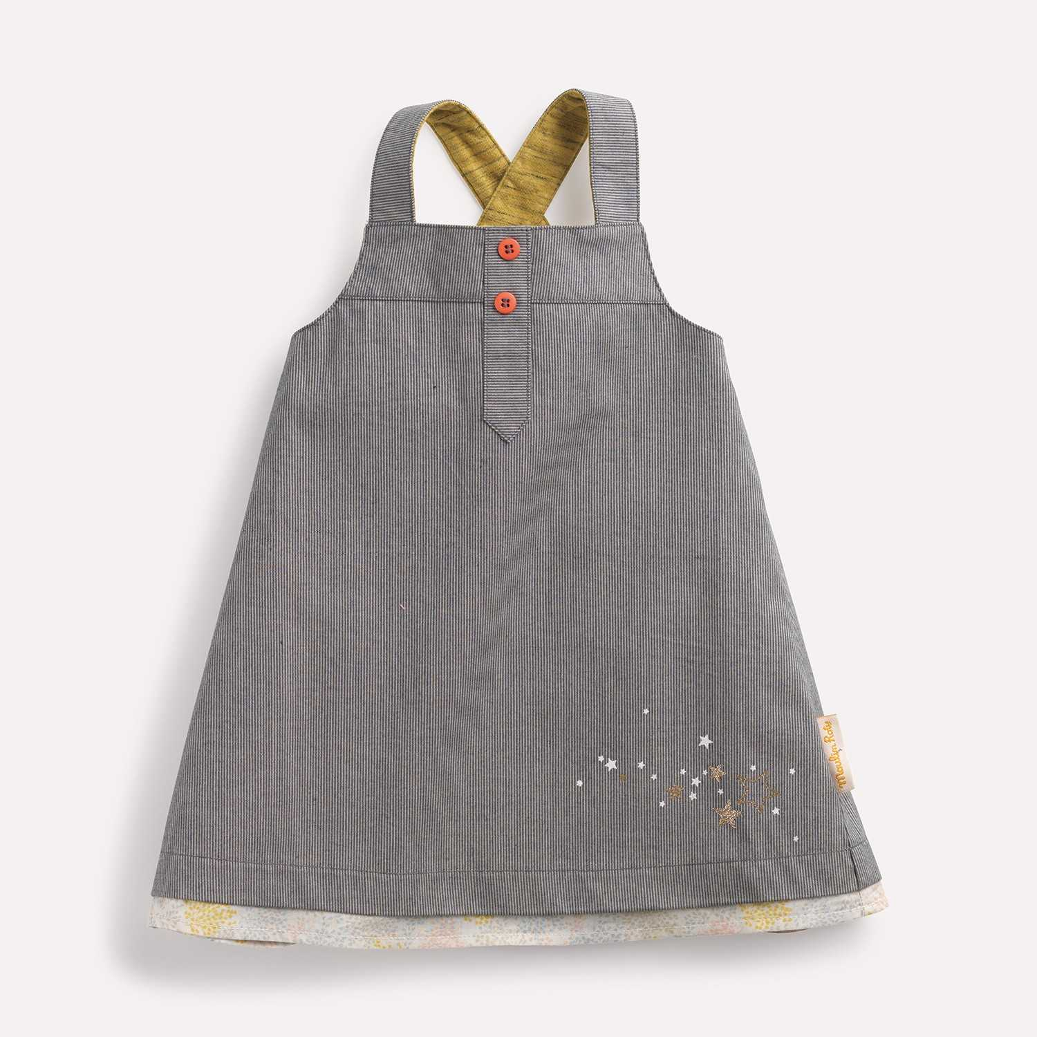 Robe à bretelles forme trapèze, en toile de coton rayé blanc et noir, doublée de jersey flammé ambre au niveau du bustier avec petits boutons corail en trompe l'il, sérigraphies, étoiles blanches et or et jupon en popeline de coton fleuri au bas de la robe