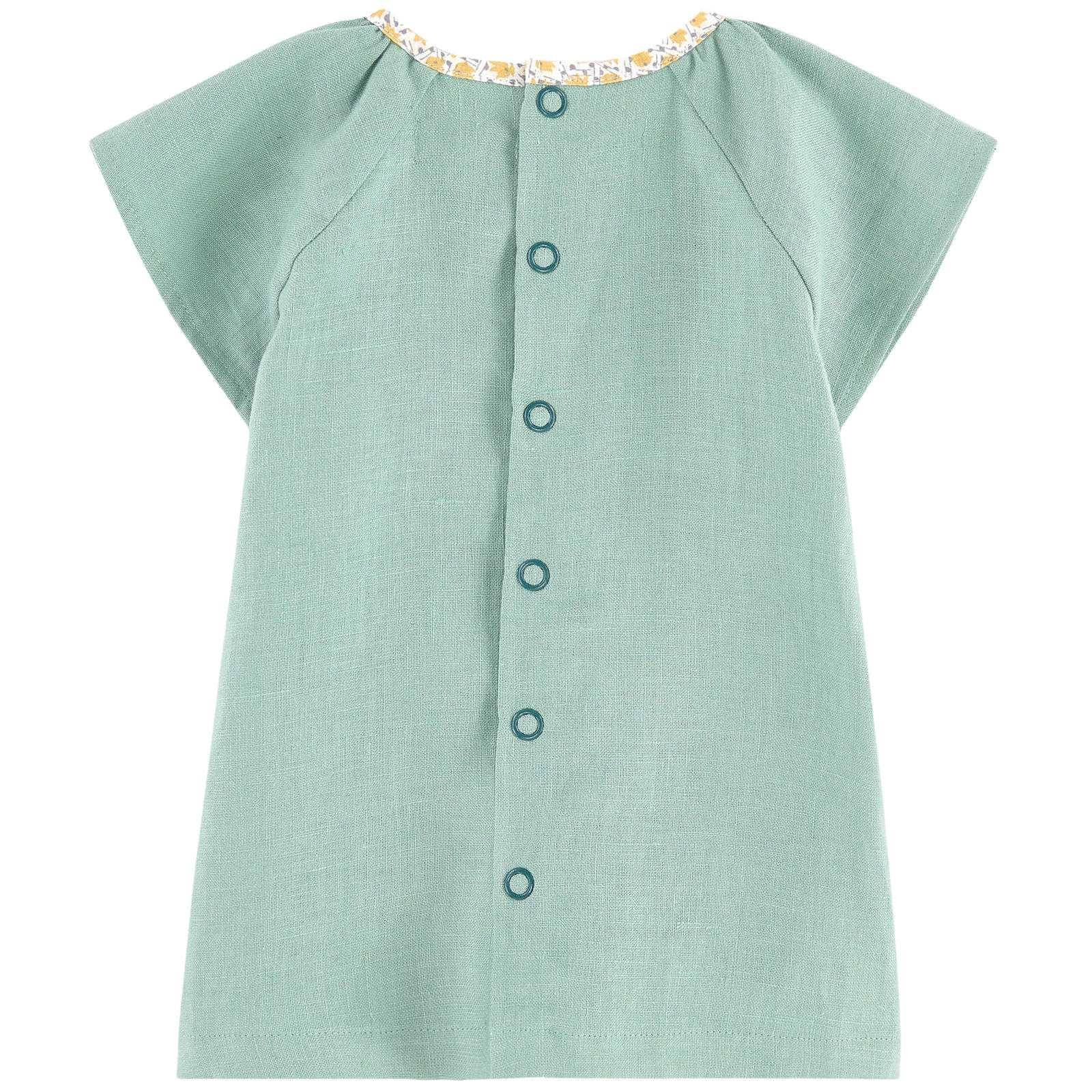 Encolure ronde gansée de coton imprimé fleuri, pli plat sur le devant, 2 petites poches et broderies confettis.Fermeture pressions dos pour un habillage facile