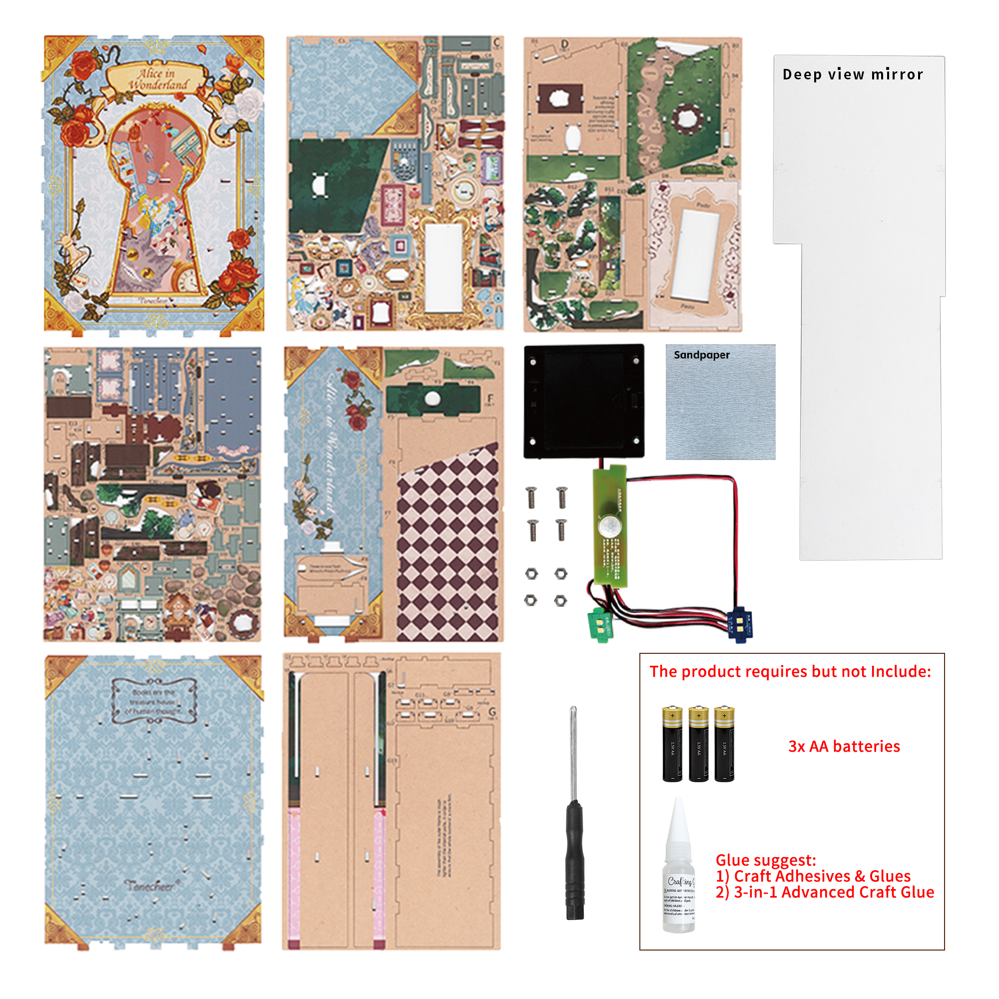 Assemblez le serre-livres DIY Booknook Alice au Pays des Merveilles de Tonecheer, un diorama 3D en bois détaillé avec éclairage LED, pour une décoration de bibliothèque magique et immersive.