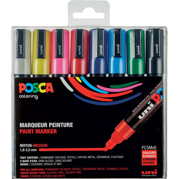 Set de 8 marqueurs Posca PC-5M à pointe conique moyenne (1,8-2,5 mm), parfaits pour dessiner, colorier et décorer sur divers supports. Peinture à base d'eau, opaque et couvrante, sans alcool ni solvant. Couleurs basiques incluses : blanc, jaune, rose, rouge, bleu foncé, bleu clair, vert foncé et noir.