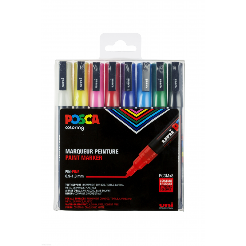 Set de 8 marqueurs POSCA PC-3M à pointe conique fine, offrant des couleurs basiques pour toutes vos créations artistiques sur divers supports.