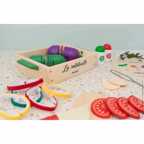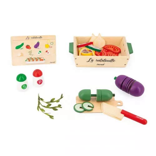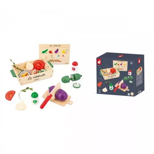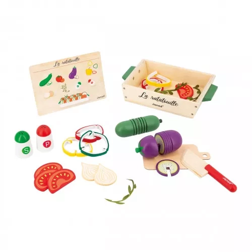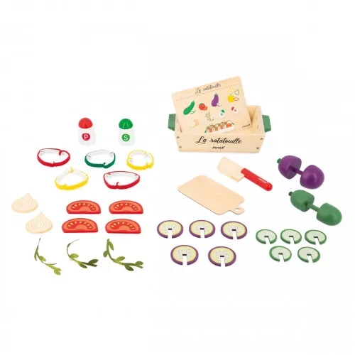 Au menu ce soir : c'est ratatouille ! Les petits chefs dès 3 ans préparent un plat plein de soleil avec ce set d'accessoires de cuisine en bois et feutrine. Comment ? Trop facile, il suffit de suivre la recette illustrée incluse ! Ce n'est pas tout, ce sont 32 accessoires au total qui sont fournis pour préparer ce célèbre plat méditerranéen : 1 courgette en bois à découper en 5 tranches, 1 aubergine en bois à découper en 5 tranches, 4 tranches de tomates en bois, 2 morceaux d'oignon en bois, 5 tranches de poivron en feutrine, 3 branches d'aromate en tissu, 1 salière et 1 poivrière en bois, 1 couteau en bois, 1 planche à découper en carton et 1 plat de cuisson en bois. Ce set d'imitation est fabriqué en bois FSC®. Voilà une dinette qui permet de réaliser un classique de la gastronomie encore et encore ! Le petit cuisinier découpe lui-même les tranches de légumes à l'aide du couteau et dispose les aliments dans le plat comme il le souhaite, idéal pour stimuler la motricité et l'imagination. Une recette à découvrir ou redécouvrir en famille, pour des moments de partage tous ensemble ! Ce plat traditionnel trouvera sa place dans la cuisine des enfants ... Ou sur le plan de travail dans la cuisine des grands !