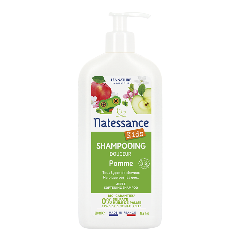 Le Shampooing Douche KIDS Pomme de Natessance est un soin 2-en-1 bio pour enfants dès 3 ans, nettoyant en douceur le corps et les cheveux, les adoucissant grâce à l'extrait de pomme et aux protéines de blé. Formulé sans sulfates ni parabènes, il ne pique pas les yeux et respecte l'équilibre capillaire.