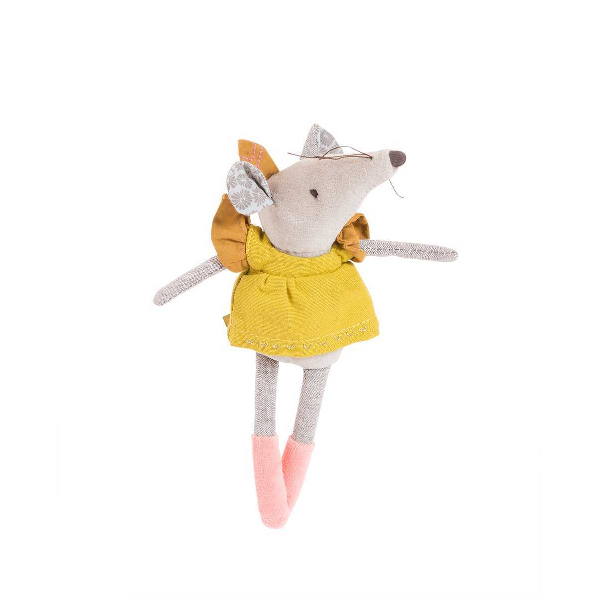 Souris Lisette Le Voyage d’Olga, Lisette est une petite souris en velours, malicieuse et coquette, vêtue d’une robe en lin brodé à volants. Elle accompagne toute la famille des oies sauvages dans leur découverte du monde et porte sur sa tête, des plumes gris-gris porte-bonheur.