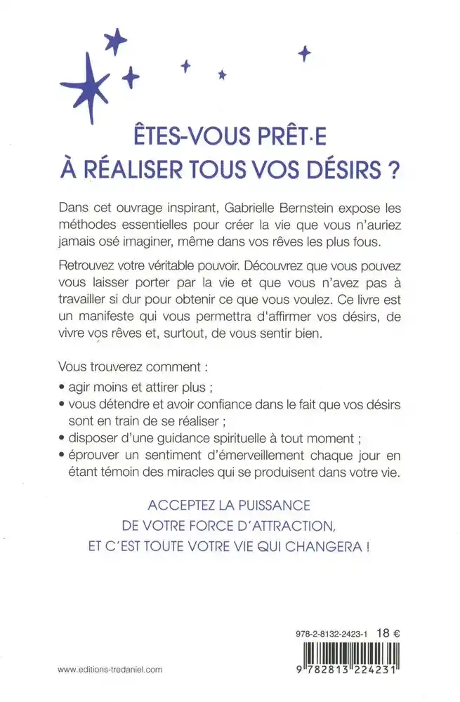 Etes-vous prêt.e à réaliser tous vos désirs ? Dans cet ouvrage inspirant, Gabrielle Bernstein expose les méthodes essentielles pour créer la vie que vous n'auriez jamais osé imaginer, même dans vos rêves les plus fous. Retrouvez votre véritable pouvoir. Découvrez que vous pouvez vous laisser porter par la vie et que vous n'avez pas à travailler si dur pour obtenir ce que vous voulez. Ce livre est un manifeste qui vous permettra d'affirmer vos désirs, de vivre vos rêves et, surtout, de vous sentir bien.