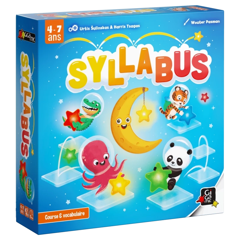 Syllabus est un jeu éducatif pour enfants dès 4 ans, combinant aventure spatiale et apprentissage du langage. Les joueurs incarnent des animaux astronautes qui voyagent d'image en image pour reconstituer leurs rêves, en avançant d'autant de cases que de syllabes dans le mot nommé. Le premier à récolter 5 étoiles et à les apporter à la lune remporte la partie.