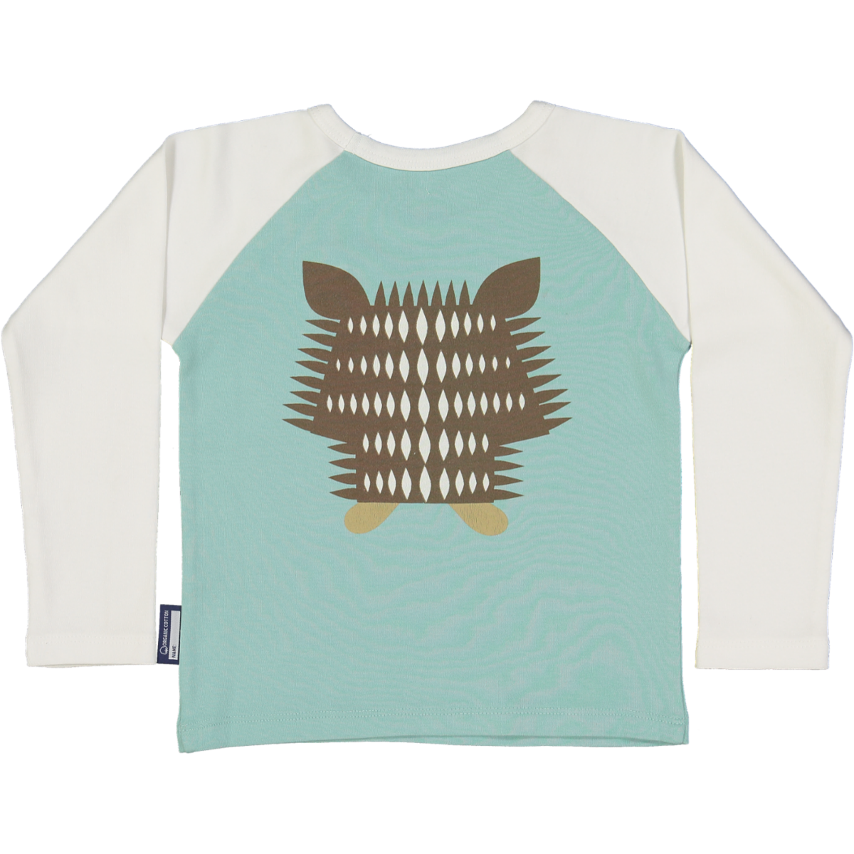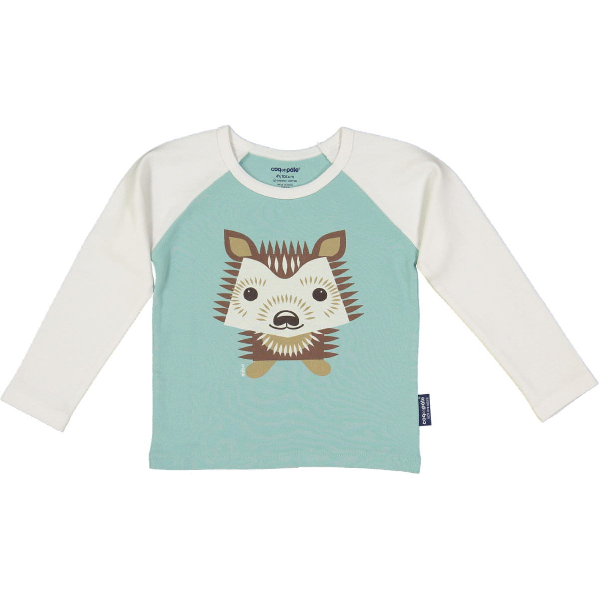 T-shirt en coton bio RAGLAN HÉRISSON de Coq en Pâte : manches longues, illustration recto-verso, 100% coton biologique certifié GOTS, encres sans PVC, disponible en plusieurs tailles.