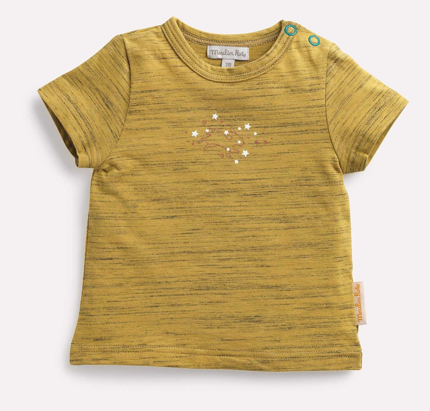 T-hirt manches courtes col rond en jersey flammé ambre avec sérigraphies petit lapin cuivré et étoiles blanches en relief. Boutons-pression encolure côté.