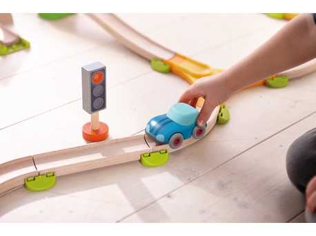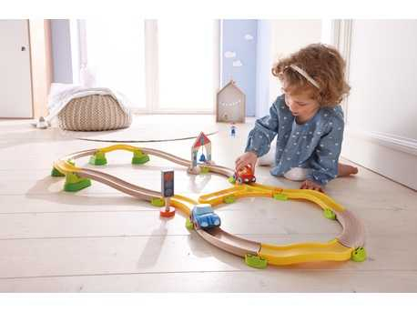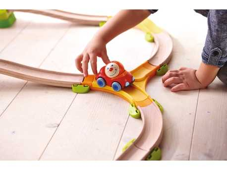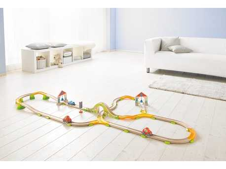 Contenu: 1 arche à clochette, 4 virages ondulés, 2 rampes, 1 feu de signalisation, 2 aiguillages, 4 virages, 17 éléments-raccords, 1 bolide bleu, 1 cabriolet rouge à bille, 1 bille Paul.