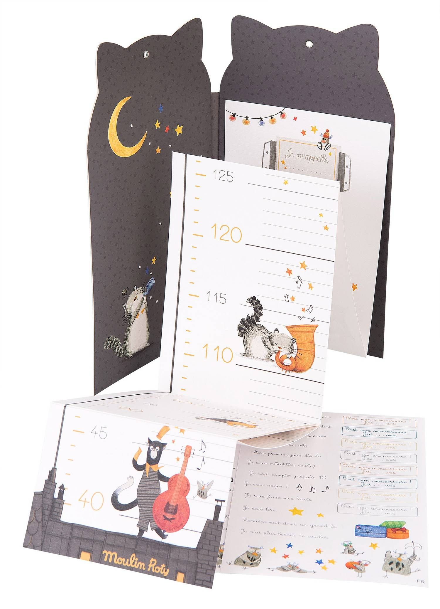 Suivez la croissance de votre enfant avec la toise carnet Les Moustaches de Moulin Roty, un accessoire décoratif et ludique avec stickers personnalisables.