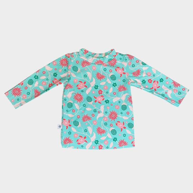 T-shirt anti-UV à manches longues pour les enfants de 3 mois à 3 ans qui protège la peau de bébé des effets nocifs des UV du soleil, dans l'eau et hors de l'eau.