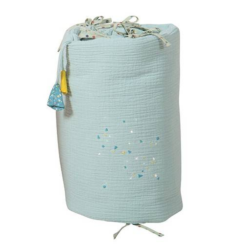 Ce tour de lit est tout en lange gaufré 100% mousseline de coton bleu grisé et agrémenté de broderies confettis. Très facile à fixer au lit grâce à ses nombreux liens en coton imprimé triangles, il aura un joli maintien. Bébé se sentira en sécurité confortablement installé dans son lit. De plus, avec son esprit déco tendance, il fera un bel élément de décoration dans la chambre de bébé. Ce tour de lit peut être complété avec le plaid et coussin assortis de la collection.