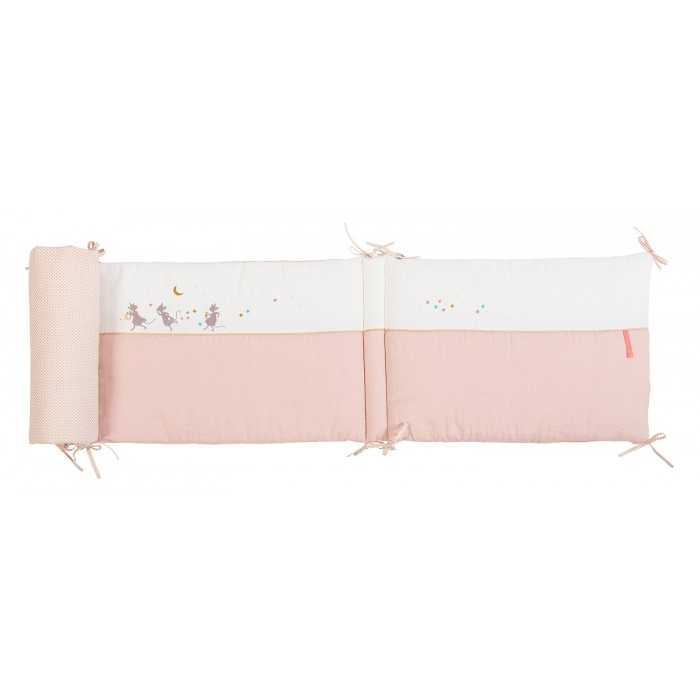 Ce tour de lit raffiné, tout en lin rose poudré, est doublé de popeline de coton à pois nacré avec ganse dorée. Il est décoré d'étoiles et d'ombres de souris trottinant la nuit avec un lanterne magique. Très facile à fixer au lit grâce à ses nombreux liens en tissus, il aura un joli maintien. Bébé se sentira en sécurité confortablement installé dans son lit. Dès la naissance, ce tour de lit accompagnera votre enfant dans ses plus douces nuits en lui apportant chaleur et réconfort. De plus, avec son esprit déco très tendance, il fera un bel élément de décoration dans la chambre de bébé et fera lunanimité !