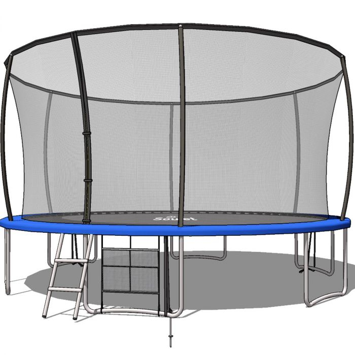 Ce trampoline de plus de 4m de diamètre supporte un poids maximal de 100 kg, pour un utilisateur à la fois. Il est livré avec tous ses accessoires : filet de protection de 1m80 de hauteur, coussin de rembourrage, échelle, kit d'ancrage, filet pour chaussures et bâche de protection.