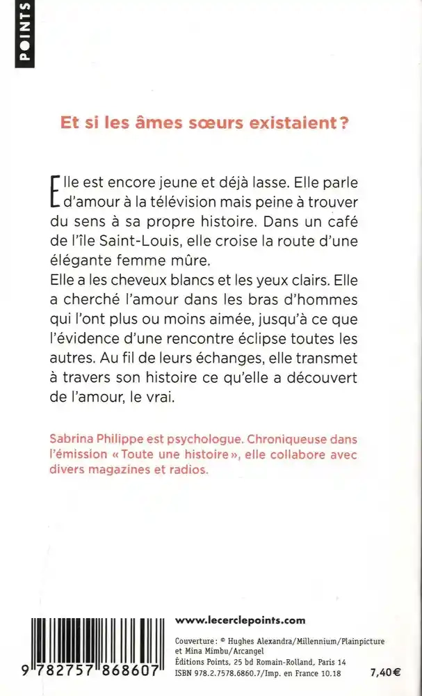 Et si les âmes soeurs existaient ? Elle est encore jeune et déjà lasse. Elle parle d'amour à la télévision mais peine à trouver du sens à sa propre histoire. Dans un café de l'île Saint-Louis, elle croise la route d'une élégante femme mûre. Elle a les cheveux blancs et les yeux clairs. Elle a cherché l'amour dans les bras d'hommes qui l'ont plus ou moins aimée, jusqu'à ce que l'évidence d'une rencontre éclipse toutes les autres.