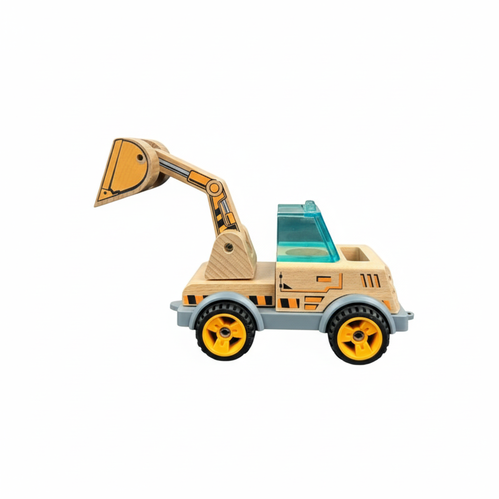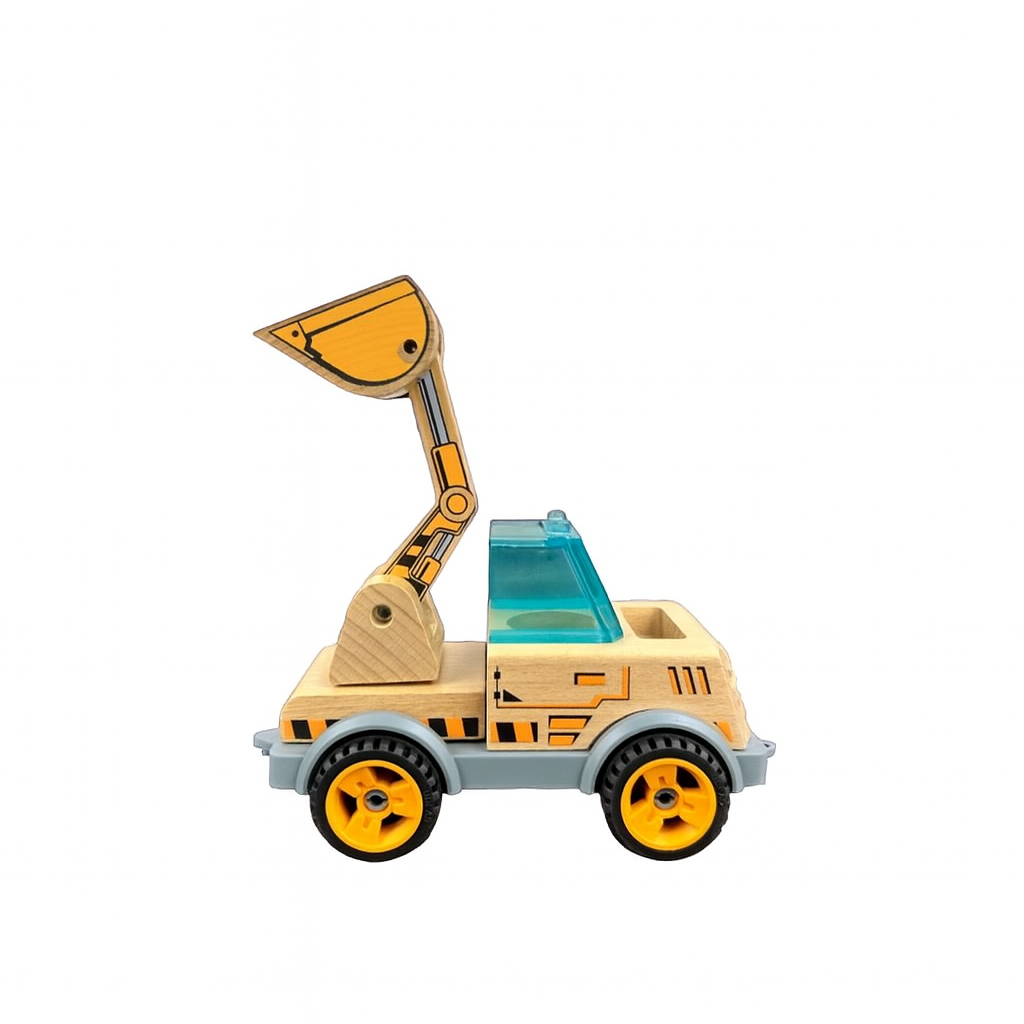 La Grande Pelleteuse Transformable de Sapin Malin est un jouet en bois massif de 23 cm avec des pièces amovibles, idéal pour développer la créativité et la motricité des enfants dès 3 ans.